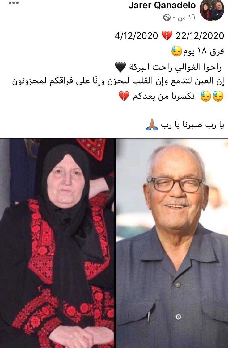 قناديلو نشر صورة جمعت بين والديه على صفحته " فيسبوك"، وكتب عليها "فرق 18 يوما.. راحوا الغوالي راحت البركة.. انكسرنا من بعدكم". ليعود بعدها ويقول "للمستهترين بكورونا.. قد نبكي على فقد المال شهرا أو سنة لكن سنبكي على فقد الأحباء دهرا".