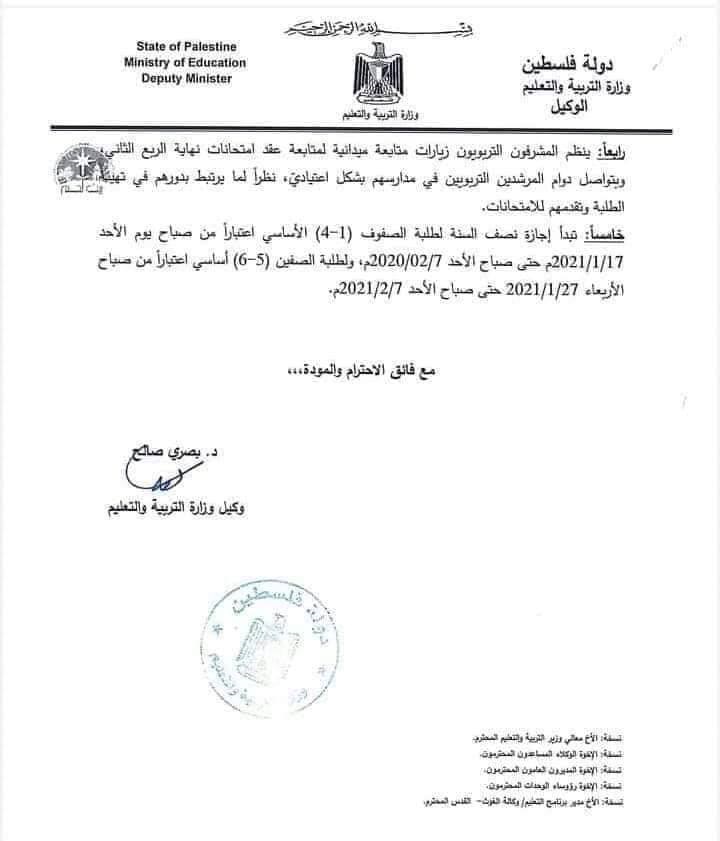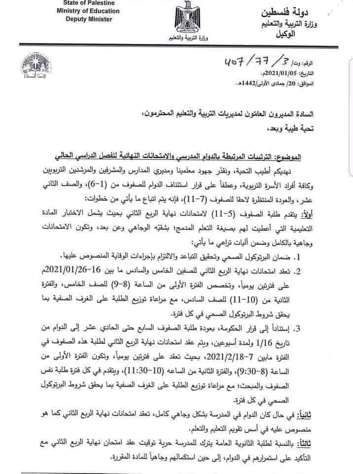 وزارة التربية والتعليم تعلن عن الترتيبات المرتبطة بالدوام المدرسي والامتحانات النهائية للفصل الدراسي الحالي.