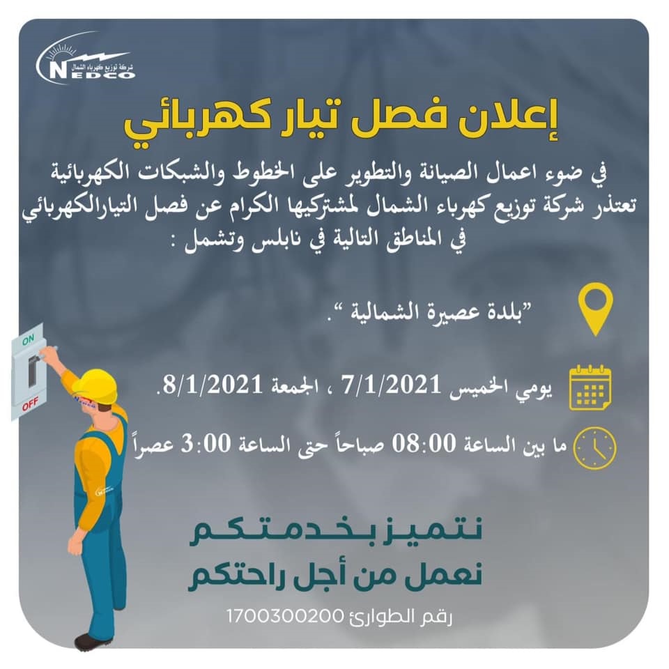 شركة توزيع كهرباء الشمال تعلن عن فصل التيار الكهربائي في عصيرة الشمالية ليومي الخميس والجمعة 07/08.01.2021.