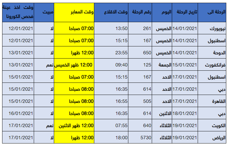 ودعا فريق العمل في بيان له، مساء الاثنين 11.01.2021، جميع الذين سجلوا سابقا وجرى إبلاغهم بحصولهم على الموافقات اللازمة، والذين سجلوا عبر المنصة المباشرة، إلى الحجز وشراء التذاكر على متن رحلات الملكية كما هو موضح في الجدول التالي، عبر نظام الحجز الالكتروني