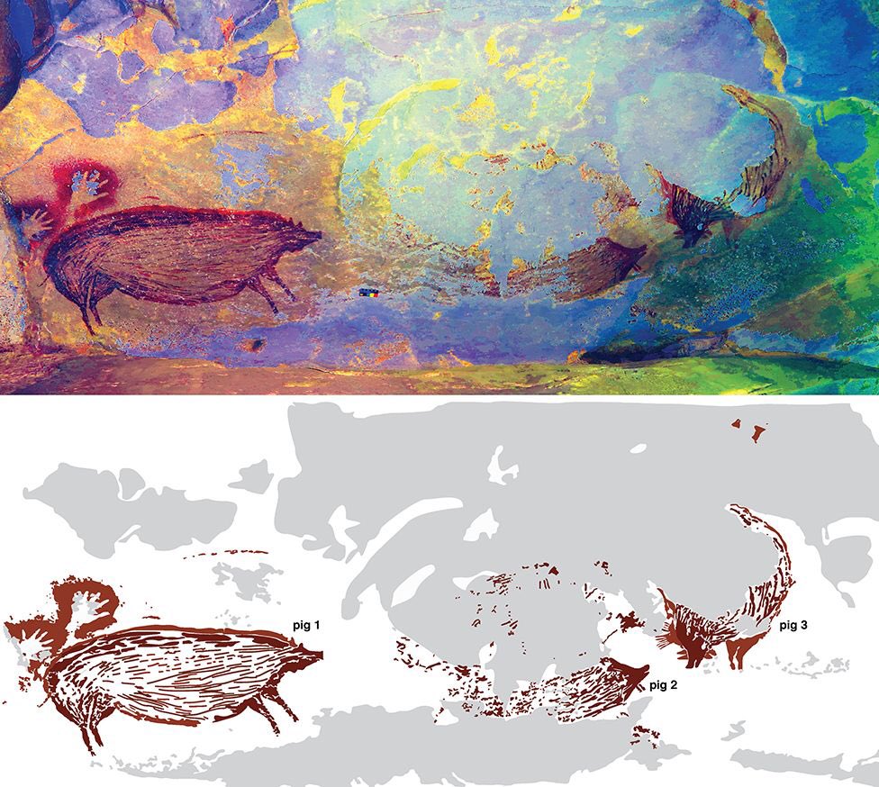تم العثور على أقدم لوحة فنية صخرية مؤرخة في السابق من قبل نفس الفريق في سولاوسي (جزيرة تحكمها إندونيسيا). وصورت مجموعة من شخصيات جزئية بشرية وجزء من الحيوانات تصطاد الثدييات، وتبين أن عمرها على الأقل 43900 عام.