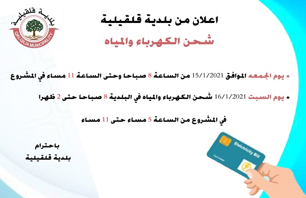 بلدية قلقيلية تعلن عن موعد شحن الكهربا والمياه في نهاية الأسبوع.