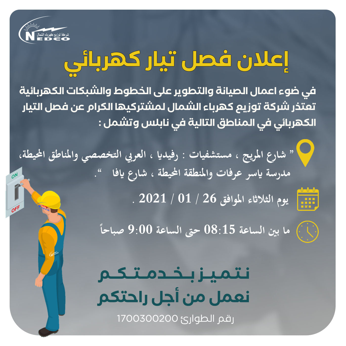 فصل الكهرباء لمدة ساعة إلا ربع في عدة مناطق غربي مدينة نابلس.