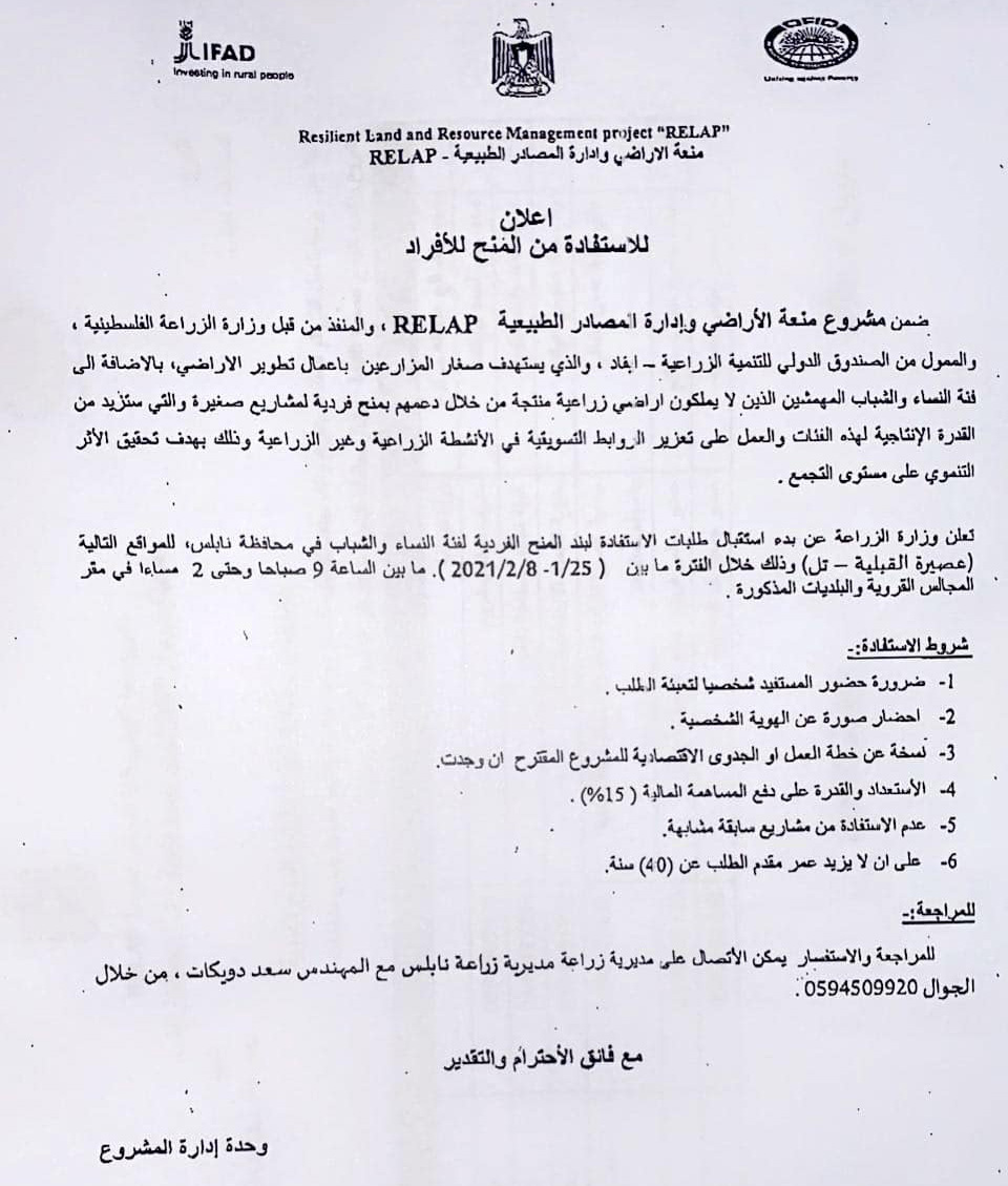 "على الراغبين في الاستفادة من مشروع منعة الأراضي وإدارة المصادر الطبيعية، منح للأفراد (المشاريع الصغيرة)، والتي ستزيد من القدرة الإنتاجية لفئة الشباب والنساء فئة العمر من 18 إلى 40 عاما، التوجه إلى مقر المجلس لتعبئة الطلب من الثلاثاء 26.01.2021 وحتى تاريخ 08.02.2021.