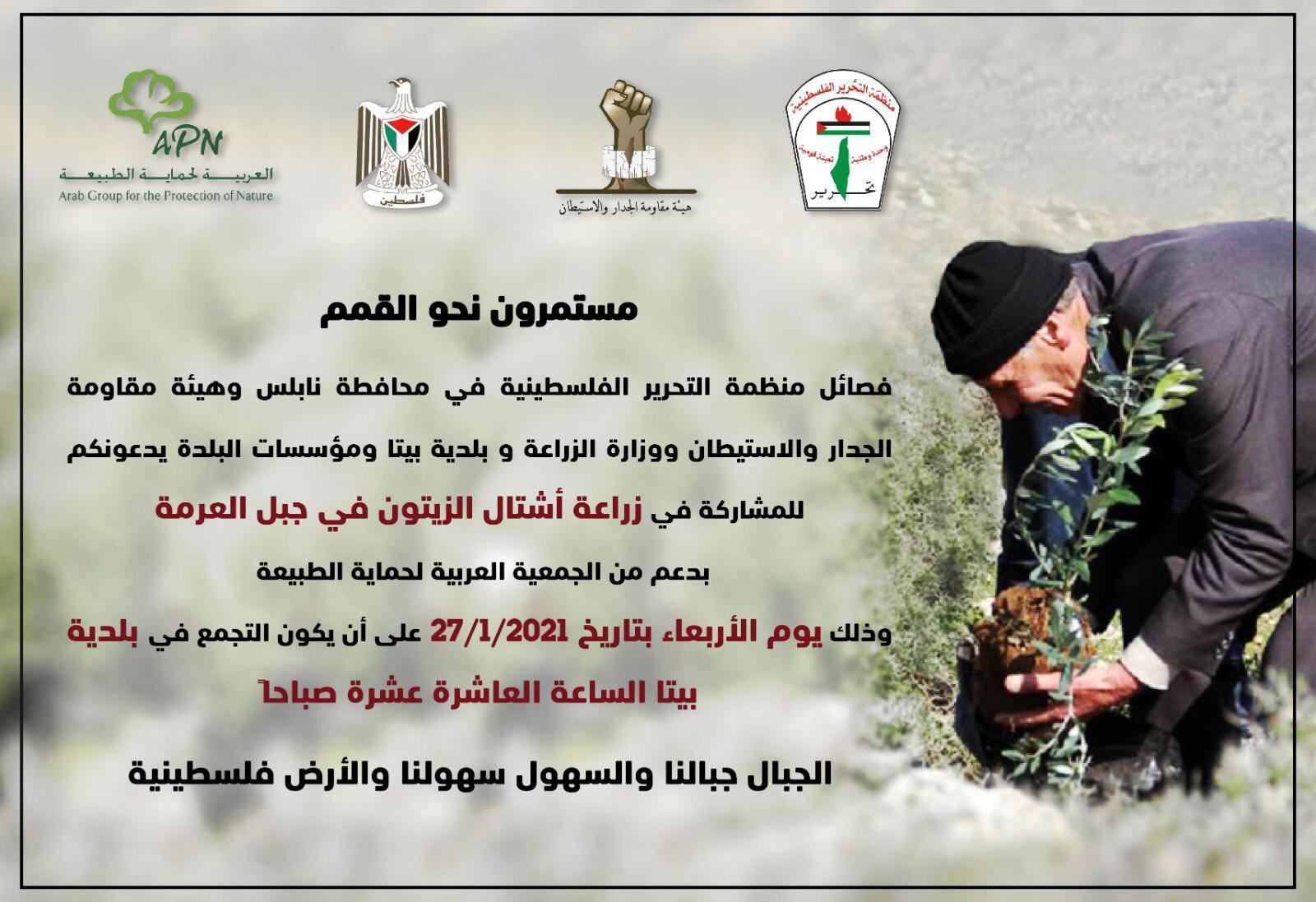 تدعوكم بلدية بيتا لزراعة أشجار الزيتون في منطقة جبل العرمة، الأربعاء 27.01.2021، التجمع أمام مبنى البلدية الساعة العاشرة صباحاً.