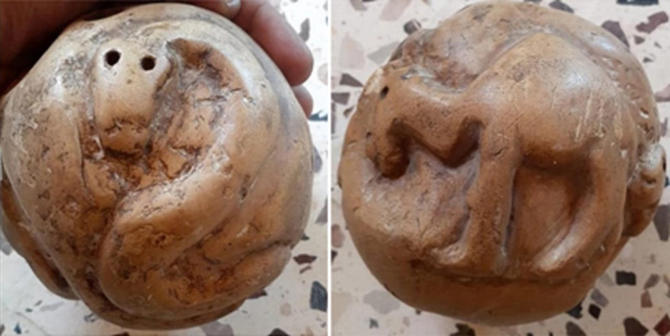 قطعة أثرية تعرض لنا قصة الجمل والحيةوالآن، يبدو أنني عثرت على دليل ملموس على ما استنتجته من قبل استنتاجاً. ففي أحد المواقع المختصّة لعارضي اللقى الأثرية والباحثين عن الذهب على كرة صغيرة منحوتة، تبدو حجرية، تُصور جملاً على أحد وجهيها، وحية على الوجه الآخر.