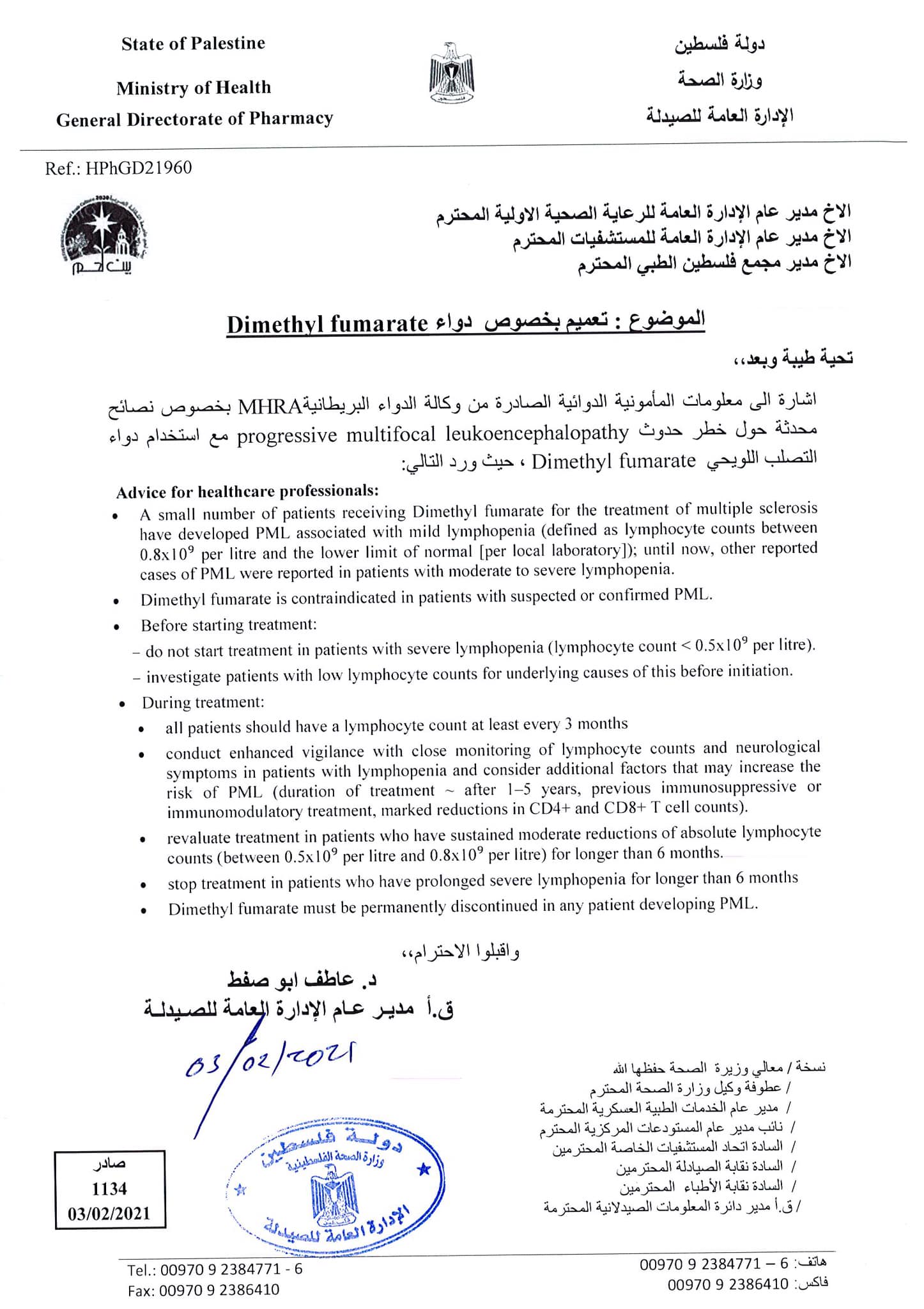 الإدارة العامة للصيدلة تنشر تحذيرا بخصوص الأعراض الجانبية الممكنة في حال استخدام أحد أدوية التصلب اللوحي صادر عن وكالة دواء بريطانية.