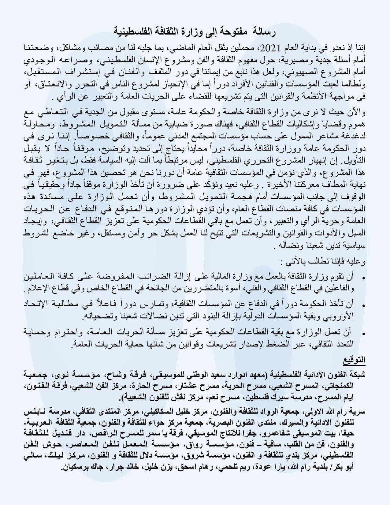 نشرت مدرسة نابلس للفنون الأدائية والسيرك مع عدد من الجمعيات والمراكز الثقافية، الخميس 04.02.2021، رسالة مفتوحة إلى وزارة الثقافة، حول هموم وقضايا وإشكاليات القطاع الثقافي، وفيما يلي نص الرسالة: