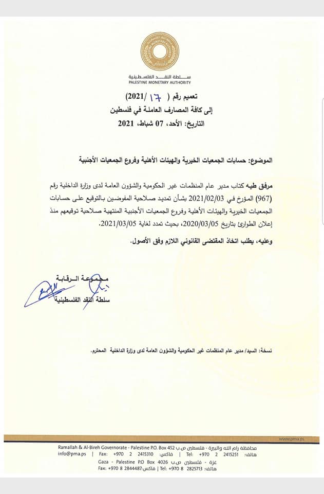 الإدارة العامة للمنظمات غير الحكومية والشؤون العامة، تعمم على المصارف العامة في فلسطين، تمديد صلاحية المفوضين بالتوقيع على حسابات الجمعيات والهيئات الأهلية والأجنبية، لمدة 30 يوماً.