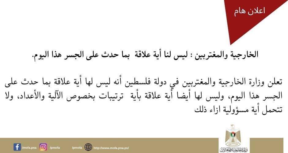 بعد السماح لعدد من العالقين بعبور الجسر وفتحه أمام القادمين من الأردن، وزارة الخارجية تؤكد أن ليس لها صلة لها بما حدث اليوم على الجسر.