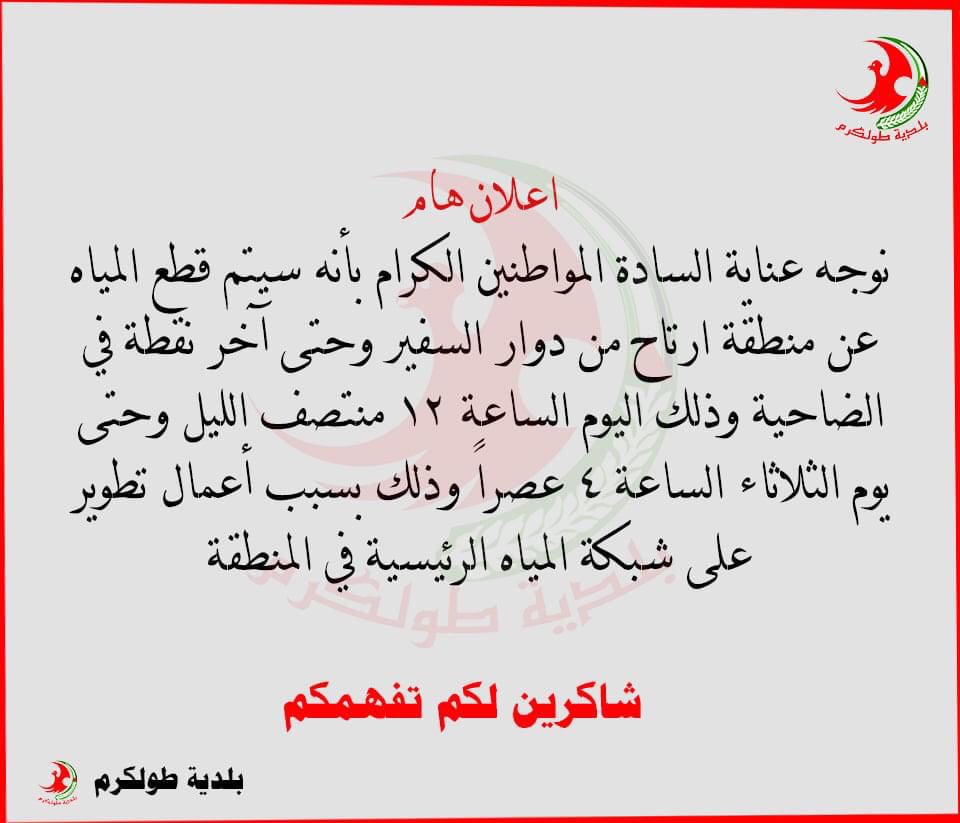 بلدية طولكرم تعلن عن قطع المياه عن ضاحية ارتاح، وذلك بسبب أعمال تطوير على شبكة المياه الرئيسية في المنطقة.