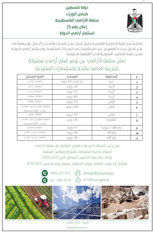 أعلنت سلطة الأراضي، الأربعاء 10.02.2021، عن توفر أراض مملوكة للخزينة العامة صالحة للاستثمارات المتنوعة، ويأتي ذلك تماشيا مع خطة الحكومة التنموية بخلق فرص عمل للشباب وأصحاب الأعمال، ضمن خطة العناقيد التنموية التي أطلقتها الحكومة.