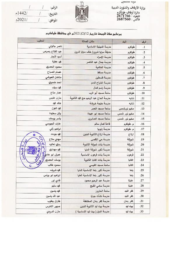 مديرية أوقاف طولكرم تنشر قائمة بأسماء الأئمة في مساجد طولكرم وضواحيها وقراها ليوم الجمعة.