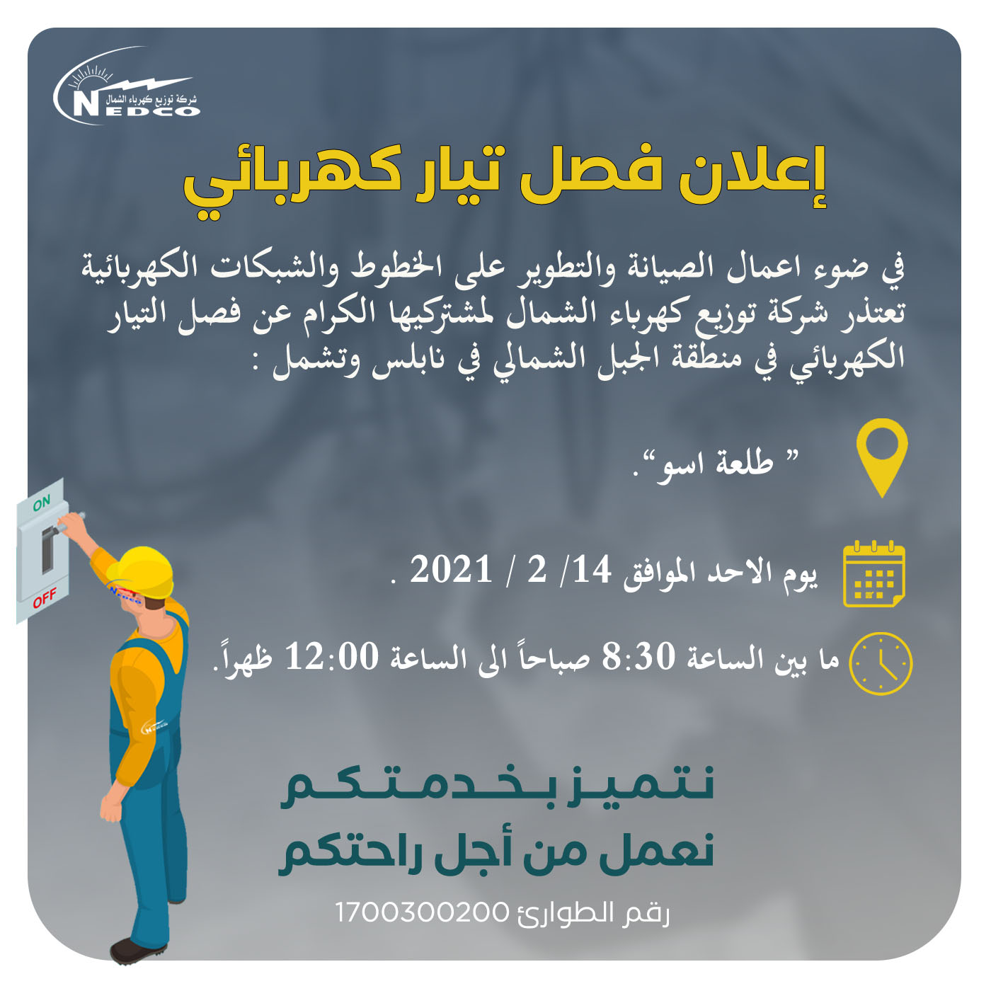 شركة توزيع كهرباء الشمال تعلن عن فصل التيار الكهربائي في منطقة الجبل الشمالي في مدينة نابلس.