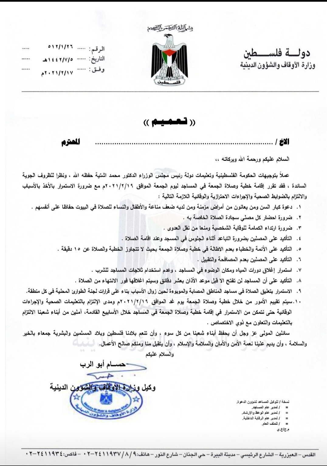 أعلنت وزارة الأوقاف والشؤون الدينية، الخميس 18.02.2021، نظرا للظروف الجوية السائدة، وعملا بتوجيهات الحكومة وتعليمات رئيس الوزراء، عن أن خطبة وصلاة الجمعة في المساجد، الجمعة 19.02.2021، مع ضرورة الالتزام بالضوابط الصحية والإجراءات الوقائية.