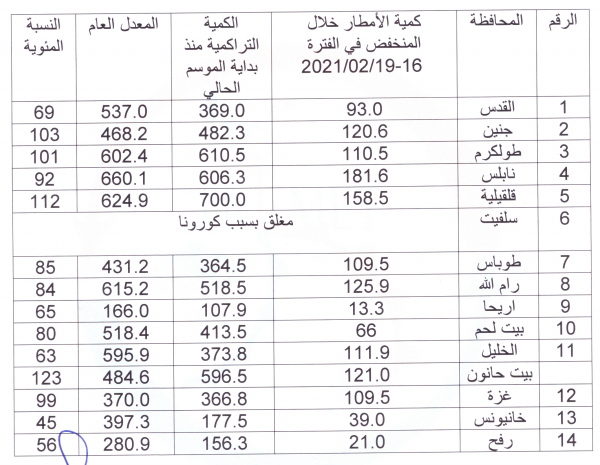 أعلنت دائرة الأرصاد الجوية، الأحد 21.02.2021، عن كميات الأمطار الهاطلة على المحافظات الرئيسية خلال المنخفض الجوي الأخير في الفترة ما بين 16 إلى 19 شباط 2021.