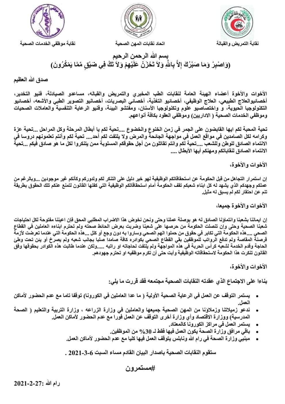 المصدر: نقابة التمريض والقبالة الفلسطينية / طولكرم