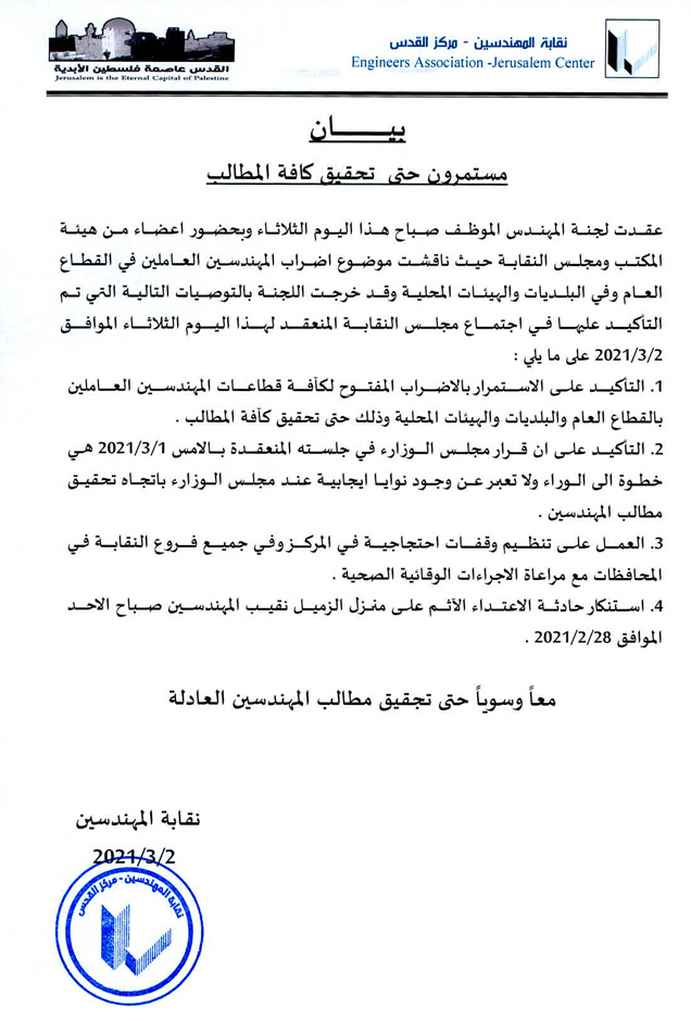 نقابة المهندسين تؤكد على الاستمرار بالإضراب المفتوح لكافة قطاعات المهندسين العاملين في القطاع العام والبلديات والهيئات المحلية.
