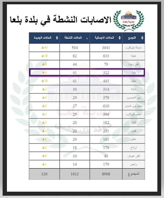 نشرت بلدية بلعا، الأربعاء 03.03.2021، أعداد الإصابات النشطة في بلدة بلعا، ومحافظة طولكرم.