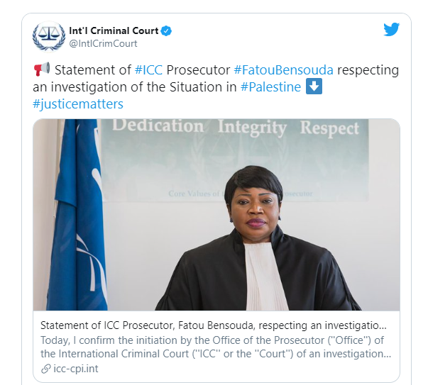 وفي ديسمبر/ كانون الأول 2019 قالت بنسودا التي سيخلفها في المنصب البريطاني كريم خان في 16 يونيو/ حزيران المقبل إن "جرائم حرب ارتكبت أو ترتكب في الضفة الغربية، لا سيما القدس الشرقية وفي قطاع غزة". وحددت الجيش الإسرائيلي وجماعات فلسطينية مسلحة مثل حركة حماس كجناة محتملين.