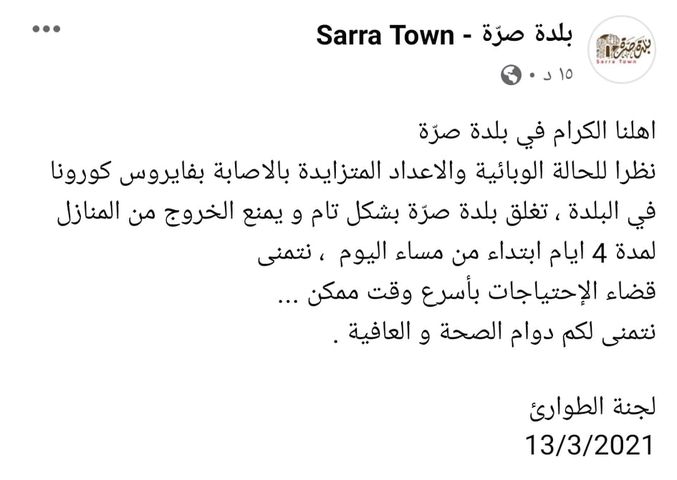 "نظرا للحالة الوبائية والأعداد المتزايدة بالاصابة بفايروس كورونا في البلدة، تغلق بلدة صرّة بشكل تام ويمنع الخروج من المنازل لمدة 4 أيام ابتداء من مساء السبت، نتمنى قضاء الإحتياجات بأسرع وقت ممكن".