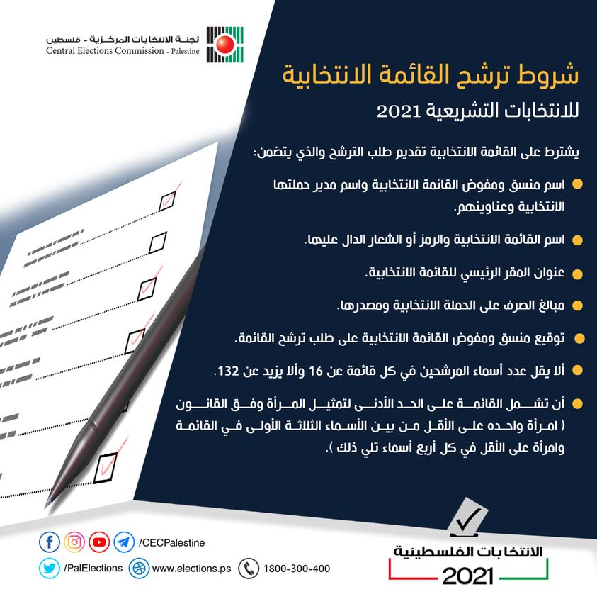 لجنة الانتخابات المركزية تعلن عن شروط ترشح القائمة الانتخابية للانتخابات التشريعية 2021.