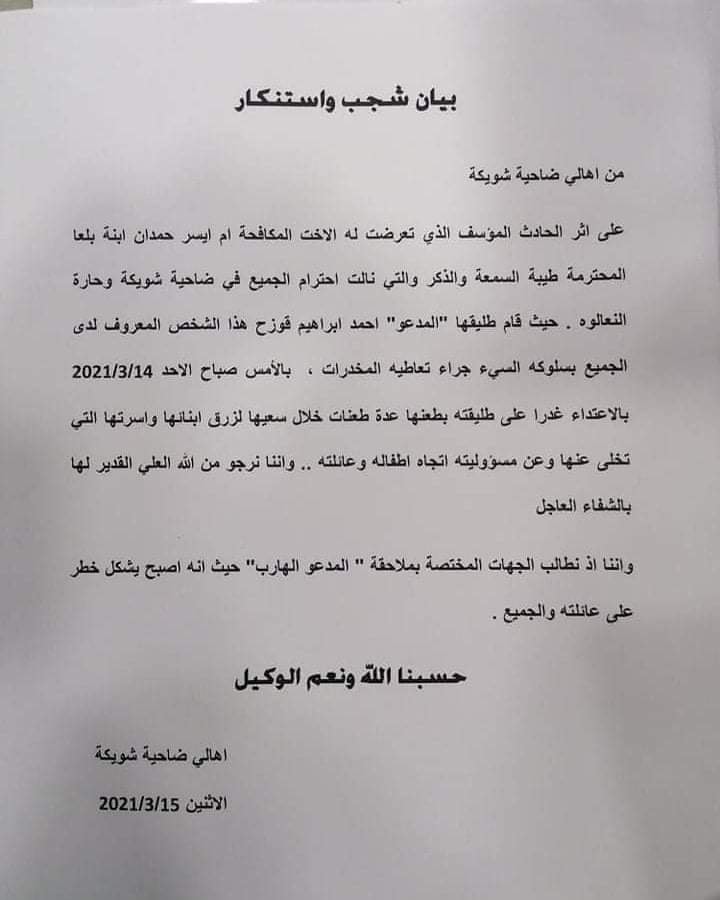 بيان شجب واستنكار من مواطنين في ضاحية شويكة بخصوص الحادث الذي تعرضت له مواطنة من بلدة بلعا.