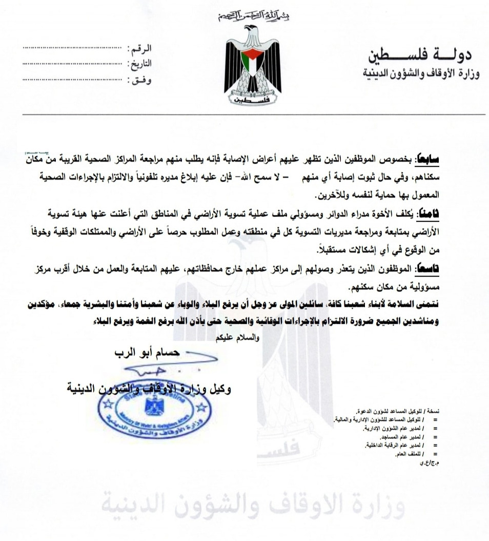 وزارة الأوقاف والشؤون الدينية تعلن بأن الصلاة في المساجد في كافة البلدات والقرى والتجمعات السكانية، ويستثنى من ذلك المناطق التي يتم إغلاقها.