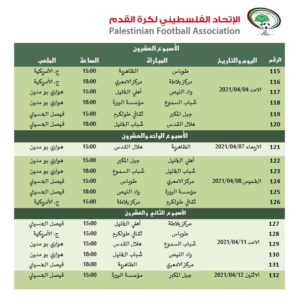 أعلن الاتحاد الفلسطيني لكرة القدم، الاثنين 22.03.2021، عن جدول مباريات الأسابيع الـ20 والـ21 والـ22 من دوري المحترفين، وذلك على النحو الآتي:
