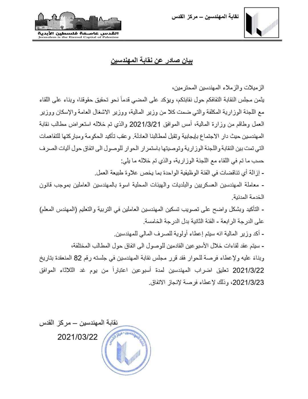 نقابة المهندسين: تعليق الإضراب أسبوعين