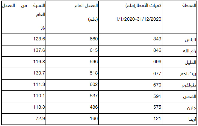 كميات الأمطار أعلى من معدلها العام خلال 2020تراوحت كميات الأمطار ما بين 849 ملم في محطة نابلس، و121 ملم في محطة أريحا، في حين أن المعدل العام لسقوط الأمطار في محطة نابلس يبلغ 660 ملم وفي محطة أريحا يبلغ 166 ملم. والجدير بالذكر أن كميات الأمطار تركزت في معظم المحافظات في شهر كانون ثاني.