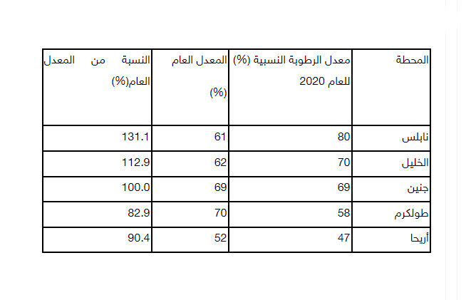 نابلس أكثر المناطق رطوبة وأقلها أريحاأظهرت البيانات أن معدل الرطوبة النسبية لعام 2020 قد تراوح ما بين 47% في محطة أريحا و80% في محطة نابلس.