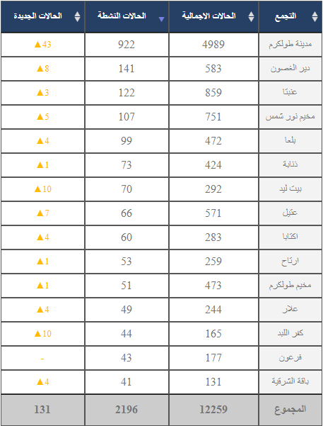 محافظة طولكرم تسجل 131 إصابة جديدة بكورونا وكان أعلاها في مدينة طولكرم وتليها دير الغصون.