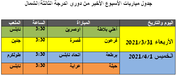 نشر الاتحاد الفلسطيني لكرة القدم، الجمعة 26.03.2021، جدول مباريات الأسبوع الأخير ضمن منافسات دوري الدرجة الثالثة/ فرع الشمال.