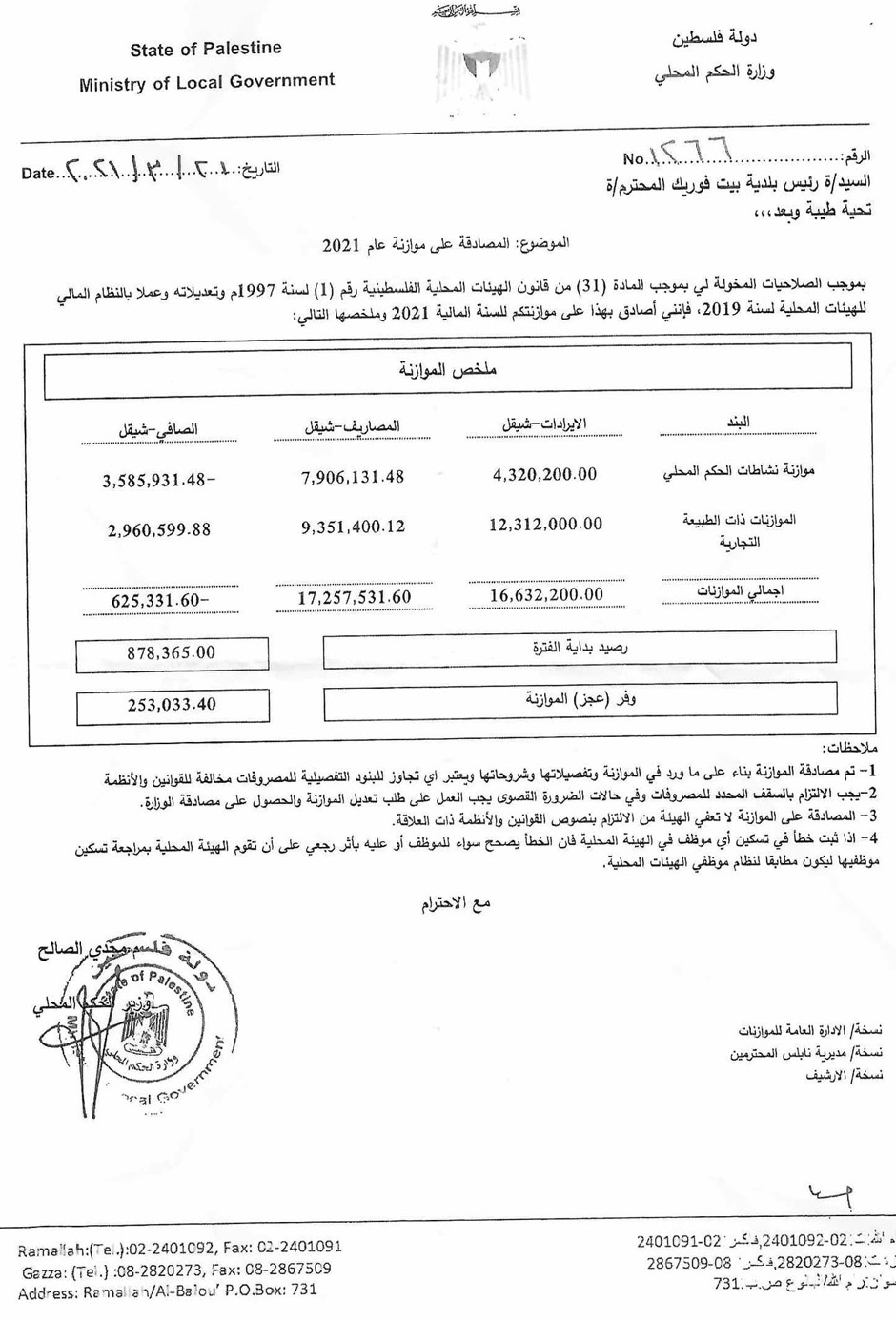 بلدية بيت فوريك تنشر ملخص الموازنة العامة المصادق عليها من الحكم المحلي لعام 2021.