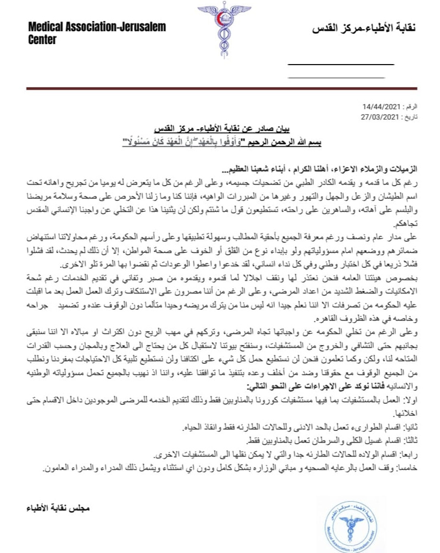أعلنت نقابة الأطباء، السبت 27.03.2021، عن إجراءات جديدة لعمل المناوبين في المستشفيات ومنها كورونا، والعمل بأقسام الطوارئ بالحد الأدنى.
