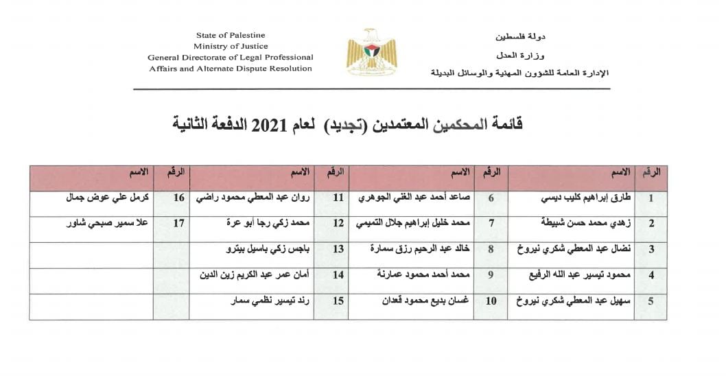 أعلنت وزارة العدل، الأحد 28.03.2021، عن القائمة الثانية لأسماء المحكمين الذين تم الموافقة على تجديد اعتمادهم للعام 2021.