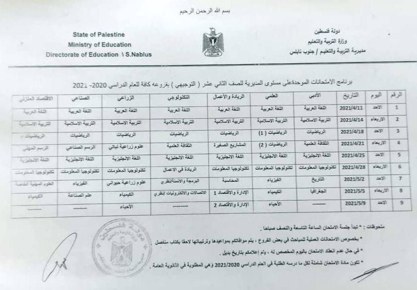 مديرية التربية والتعليم - جنوب نابلس تنشر برنامج الامتحانات الموحد لطلبة التوجيهي.