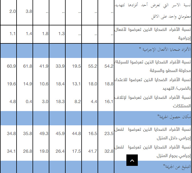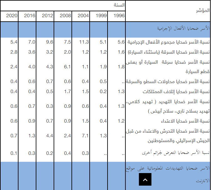 وأشار إلى أن نسبة الأسر التي تعرضت للسرقة (باستثناء سرقة السيارة) في فلسطين بلغت 2.8%، وبلغت نسبة الأسر التي تعرضت لسرقة السيارة أو بعض قطع السيارة 2.4%، وبلغت نسبة الأسر التي تعرضت ممتلكاتها إلى إتلاف 0.4%، وبلغت نسبة الأسر التي تعرض أفرادها للإعتداء 0.6%، وأما نسبة الأسر التي تعرضت لتحرشات واعتداءات جيش الاحتلال والمستوطنين فبلغت 0.7%، فيما بلغت نسبة الأسر التي تعرض أحد أفرادها لتهديد معلوماتي واحد على الاقل 2.0% (بواقع 1.4% في الضفة و3.0% في غزة).