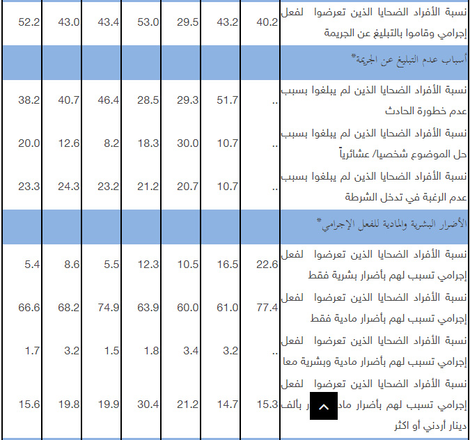 وبلغت نسبة الأفراد الضحايا الذين تعرضوا لفعل إجرامي تسبب لهم بأضرار مادية تقدر بألف دينار أردني أو اكثر 15.6% (بواقع 20.4% في الضفة و12.1% في غزة) في حين كانت نسبة الافراد الضحايا الذين تسببت لهم بأضرار مادية تقدر بأقل من ألف دينار أردني 84.4% (بواقع 79.6% في الضفة و87.9% في غزة) من اجمالي الافراد الذين تضرروا ماديا أو ماديا وبشريا معا.