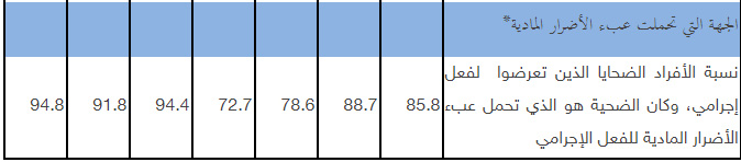 وفيما يتعلق بالجهة التي تحملت عبء الأضرار المادية، بينت النتائج أن 94.8% من الأفراد الضحايا الذين تعرضوا لفعل إجرامي هم الذين تحملوا عبء الأضرار المادية لهذه الأفعال.