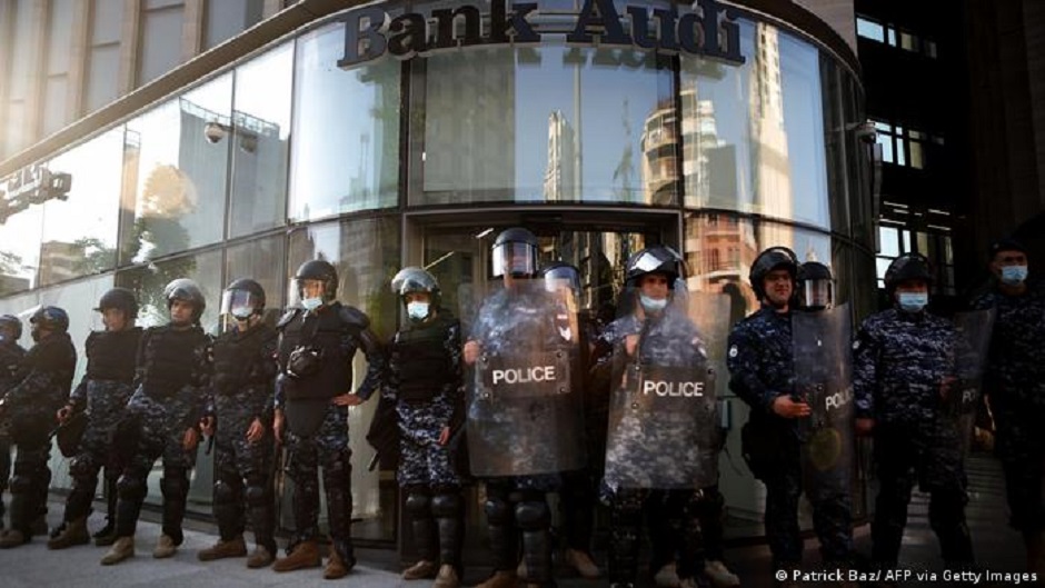ونتيجة لذلك، انتهى المطاف بلبنان إلى واحدة من أعلى نسب الدين إلى الناتج المحلي الإجمالي في العالم. ويقارن هذا الرقم بين ما ينتجه بلد ما، أي الناتج المحلي الإجمالي، وقدرته على سداد ما يدين به. ويقدر في لبنان بنحو 172٪ للعام الماضي. وبعبارة أخرى، كسبت البلاد حوالي 18 مليار دولار في عام 2020 ولكنها مدينة بنحو 93 مليار دولار. ومن بين الاقتصادات المتقدمة، لا تسجل سوى اليابان واليونان أسوأ من ذلك. الشرطة اللبنانية قامت بحراسة بنوك بيروت خلال الاحتجاجات الشعبية على الأزمة الاقتصادية