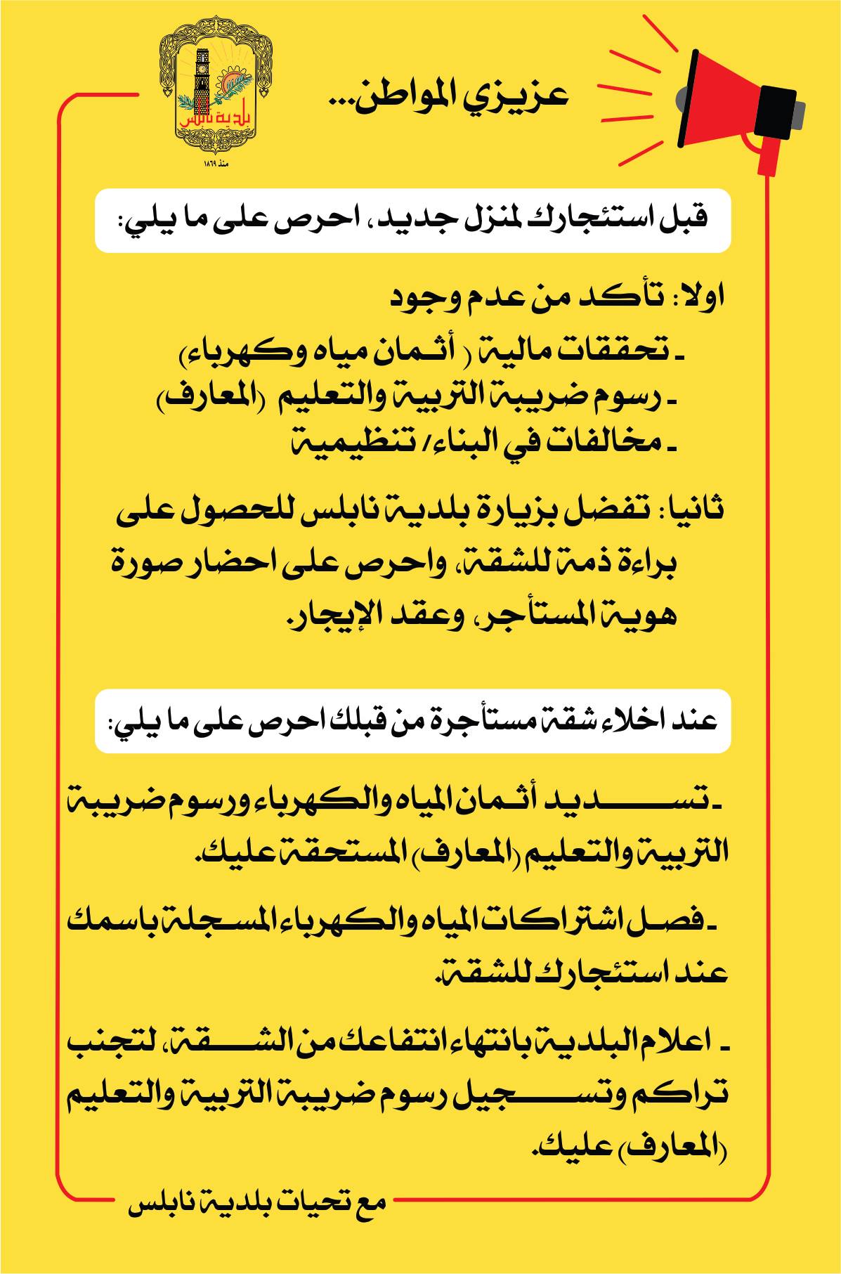 بلدية نابلس تنشر نصائح للمواطنين الذين يخططون لاستئجار منزل/ شقة، وللمواطنين الذين يخططون لإخلاء منزلهم/ شقتهم.