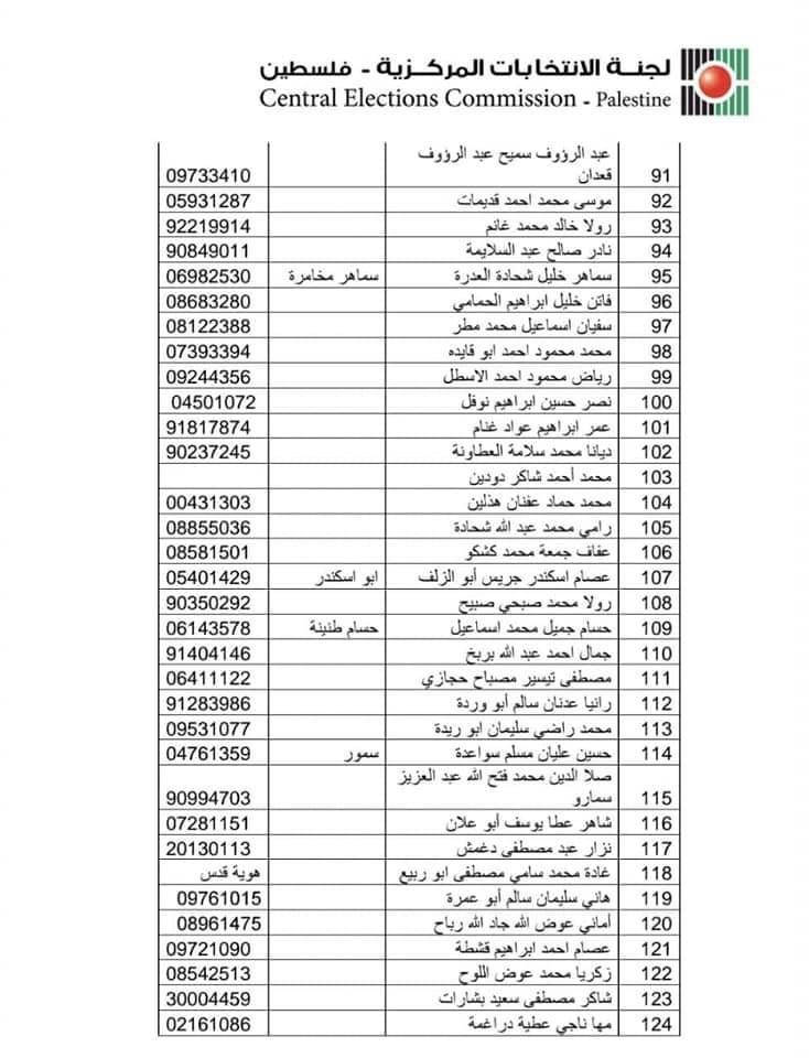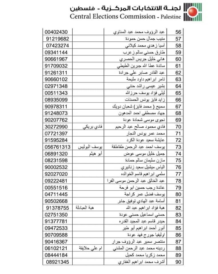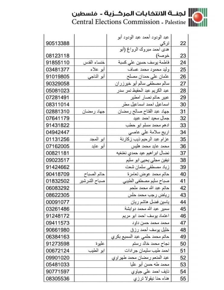 حصلت وكالة معا على الكشف النهائي لقائمة حركة فتح المقدمة للجنة الانتخابات المركزية لخوض انتخابات المجلس التشريعي المقبل.