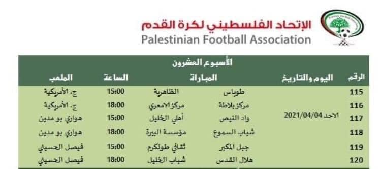نشر الاتحاد الفلسطيني لكرة القدم، السبت 03.04.2021، جدول مباريات الأسبوع الـ20 من منافسات دوري المحترفين.