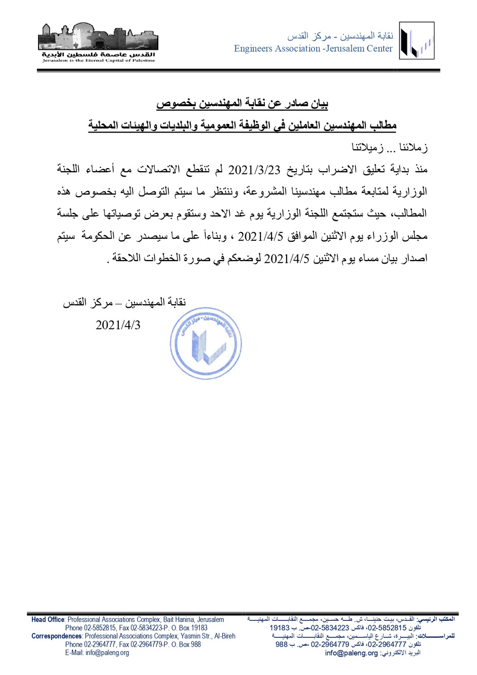 نشرت نقابة المهندسين، السبت 03.04.2021، بياناً بخصوص مطالب المهندسين العاملين في الوظيفة العمومية والبلديات والهيئات المحلية.