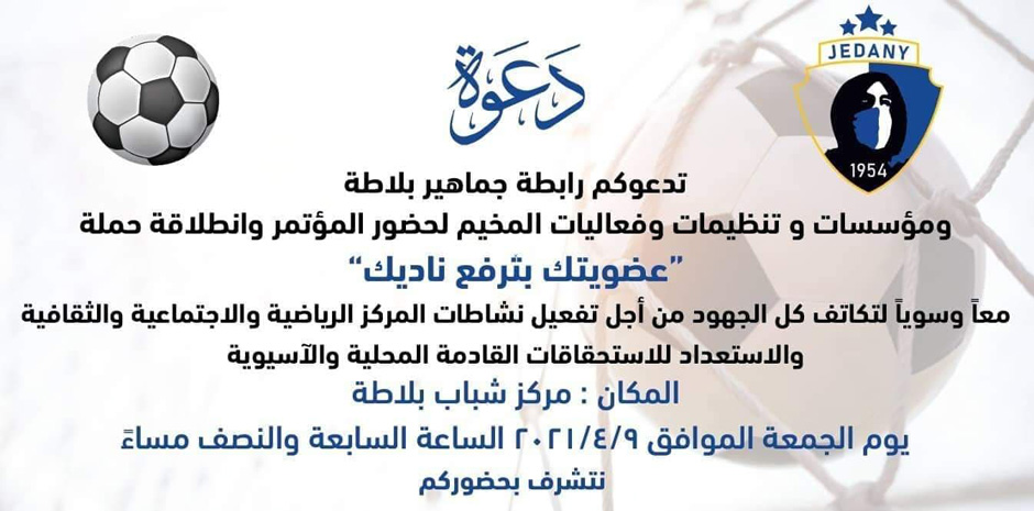 رابطة جماهير بلاطة ومؤسسات وتنظيمات وفعاليات المخيم تدعو الجماهير إلى حضور مؤتمر وإطلاق حملة "عضويتك بترفع ناديك".