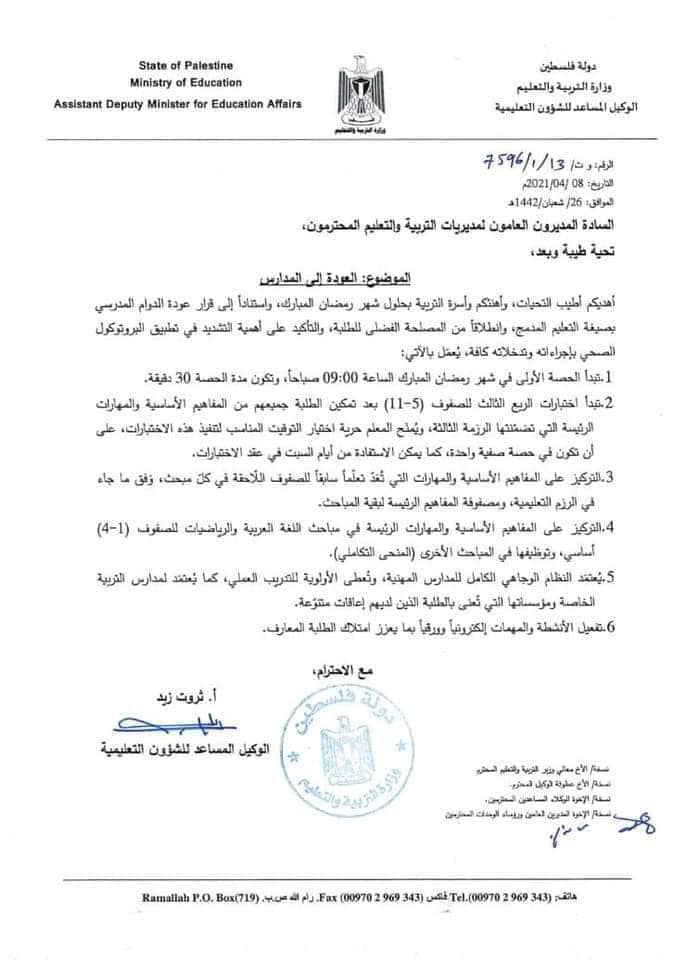نشرت وزارة التربية والتعليم، الخميس 08.04.2021، آلية دوام المدارس خلال شهر رمضان، للطلبة من صف أول وحتى صف سادس.