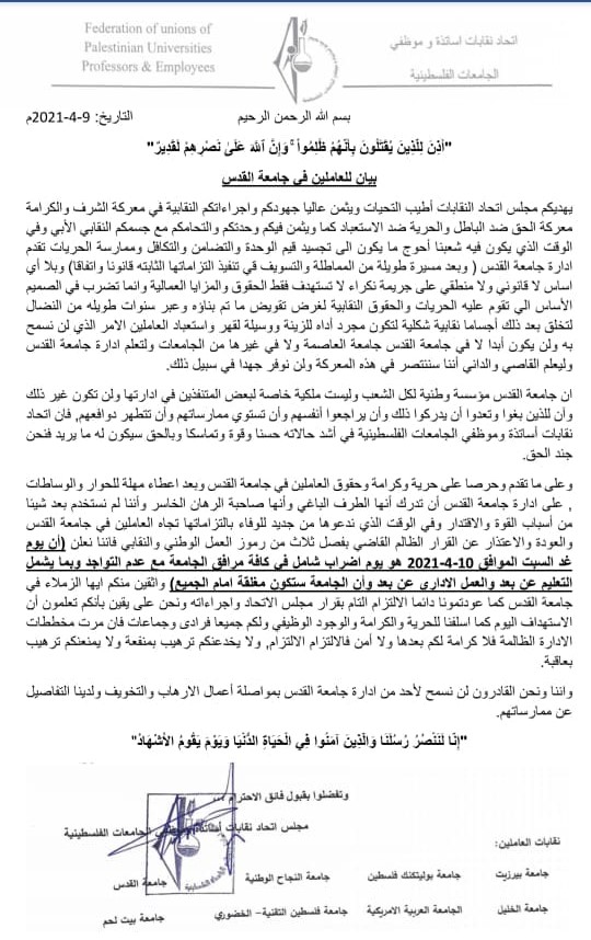 المصدر: نقابة أساتذة وموظفي جامعة القدس