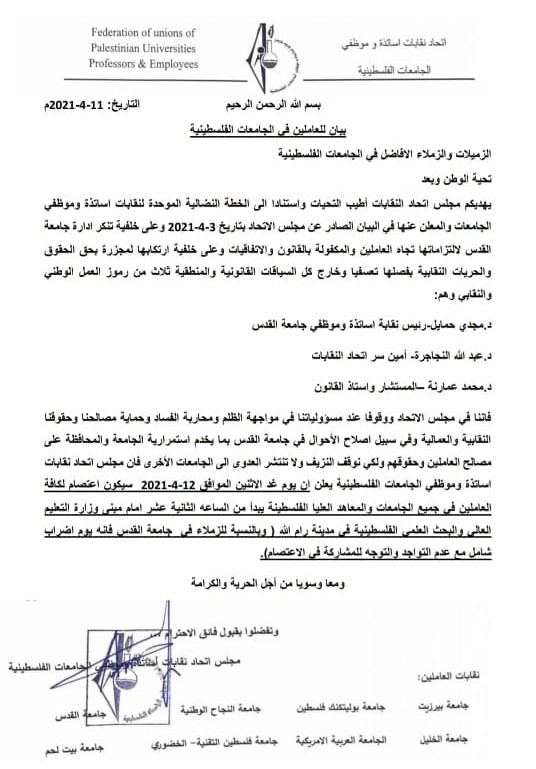 المصدر: اتحاد نقابات أساتذة وموظفي الجامعات الفلسطينية